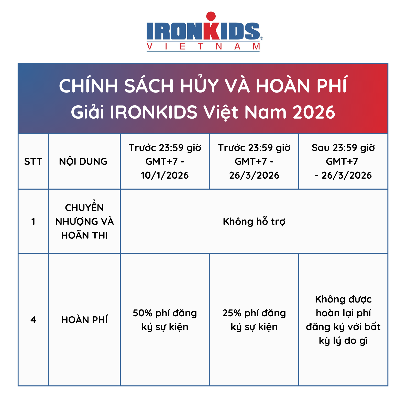 Để thúc đẩy phong trào nâng cao sức khỏe và thể lực thông qua các môn thể thao và mang đến một sự kiện IRONMAN 70.3 Đà Nẵng sôi động vào cuối tuần cho tất cả gia đình đến tham dự, cuộc thi năm nay sẽ là ngày hội thể thao đầy thú vị dành cho các vận động viên nhỏ tuổi, giúp các bé gia tăng sự tự tin khi thành công tạo nên dấu ấn riêng cho chính mình trong sự cổ vũ tinh thần của bố mẹ. Theo đó, các bé trong độ tuổi 5-10 có thể thi đấu tại hạng mục hai môn phối hợp (aquathlon), bao gồm 75 mét bơi và 1km chạy. Cự ly này tăng gấp đôi đến 150 mét bơi và 2km chạy cho các bé ở đội tuổi lớn hơn từ 11 - 15 tuổi. Đối với hạng mục ba môn phối hợp (triathlon) cũng là một phần của sự kiện năm nay, hạng mục này sẽ kết hợp cự ly của aquathlon với phần thi đạp 3km cho nhóm tuổi 5-10 và 6km cho nhóm tuổi 11-15. Với sự đa dạng trong các hạng mục thi đấu, mỗi gia đình sẽ có cơ hội tham gia bốn cuộc thi trong cùng ngày cuối tuần, càng làm cho sự kiện IRONMAN 70.3 Đà Nẵng trở thành một sự kiện đa thể thao dành cho mọi gia đình, mọi lứa tuổi và trình độ thể thao.