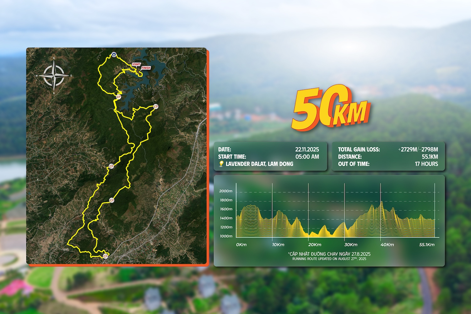 Khởi đầu từ hồ Tuyền Lâm – trái tim xanh của Đà Lạt, cung đường sẽ đưa bạn băng qua rừng già, sương mù và âm vang cồng chiêng, để rồi tìm thấy chính mình trong từng nhịp chạy.
