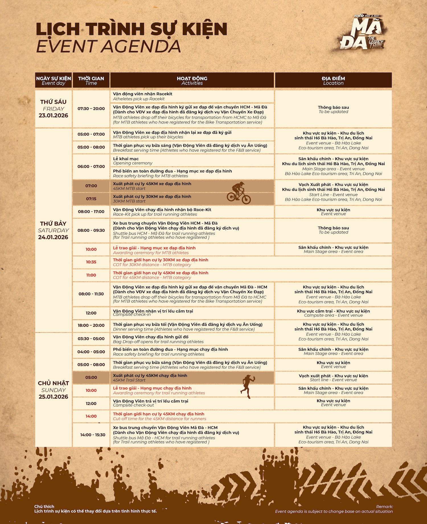 Giải MTB RIDE & RUN - MÃ ĐÀ THE LEGACY TRAIL được tổ chức bởi Việt Nam MTB Series tại rừng Mã Đà, tỉnh Đồng Nai. Địa điểm chỉ cách TP. Hồ Chí Minh khoảng 2 giờ di chuyển, Mã Đà là một trong những khu rừng nguyên sinh còn lại với địa hình đa dạng, hoang sơ và đầy thử thách – lý tưởng cho cả đạp xe địa hình và chạy địa hình. Cung đường đua đi qua những đoạn rừng cổ thụ, đất đỏ bazan, suối đá và cả các di tích lịch sử, mang đến trải nghiệm thể thao gắn liền với thiên nhiên và văn hóa. Sự kiện dự kiến thu hút hàng trăm vận động viên và người yêu thể thao từ khắp nơi trên cả nước.