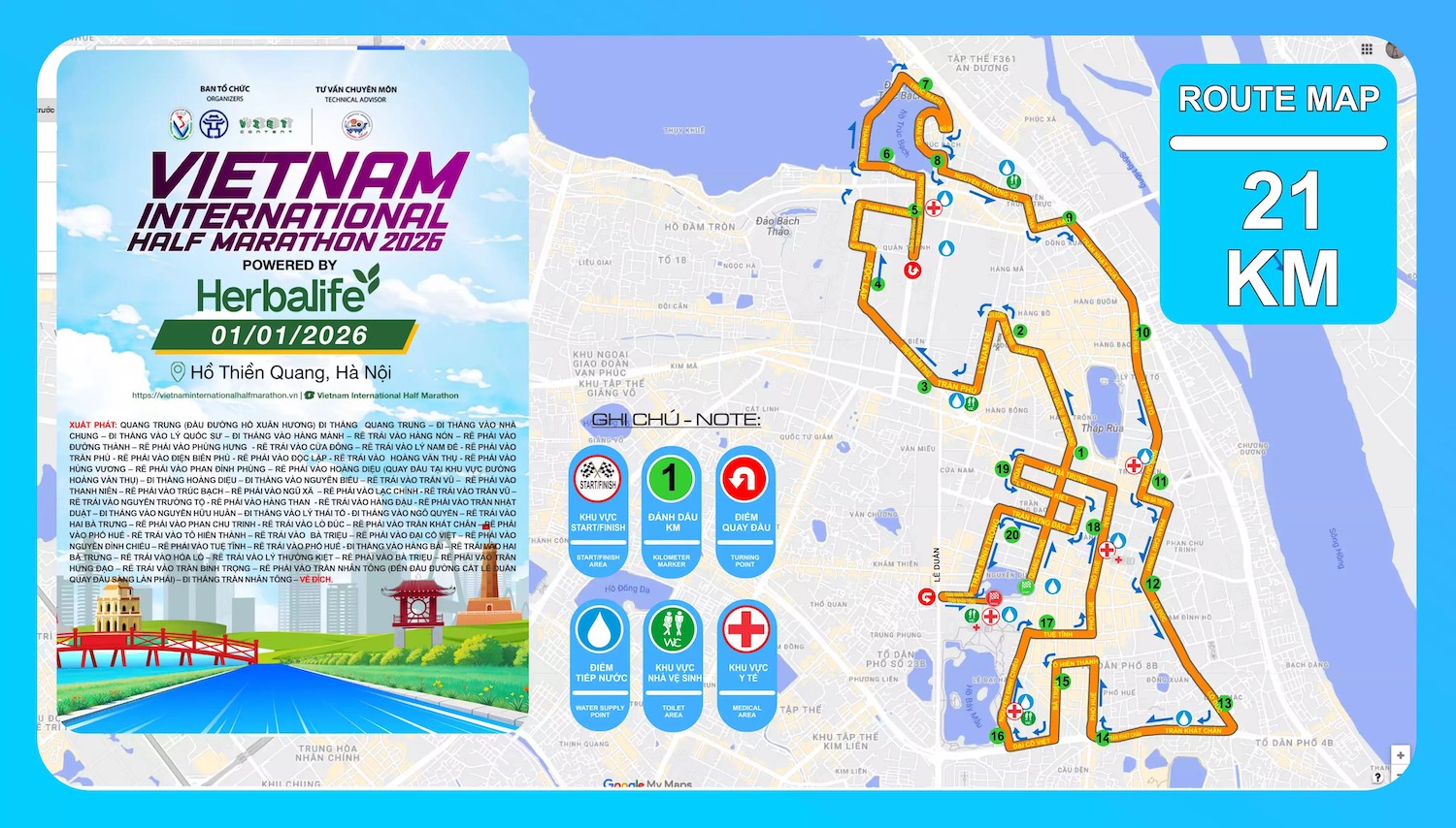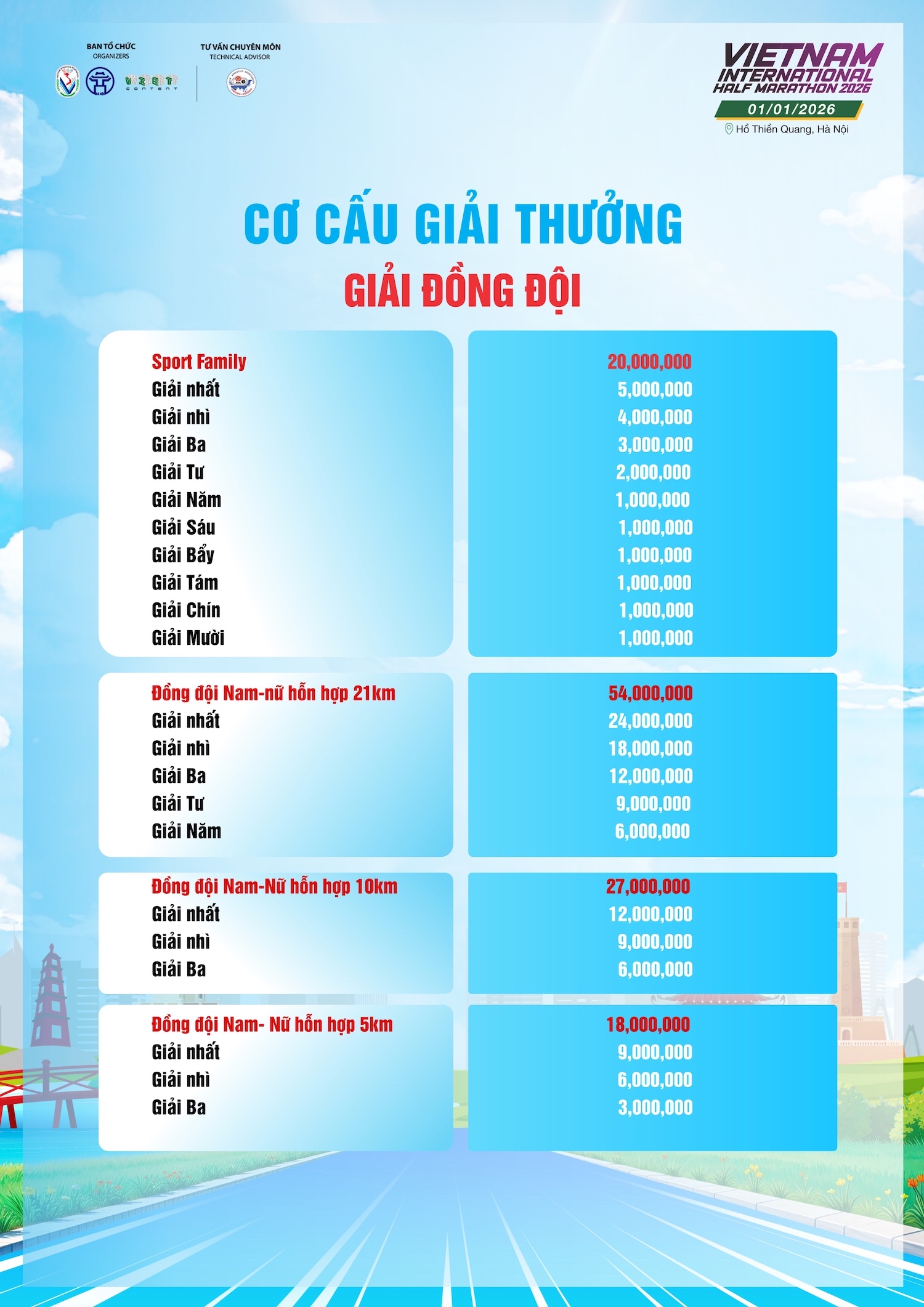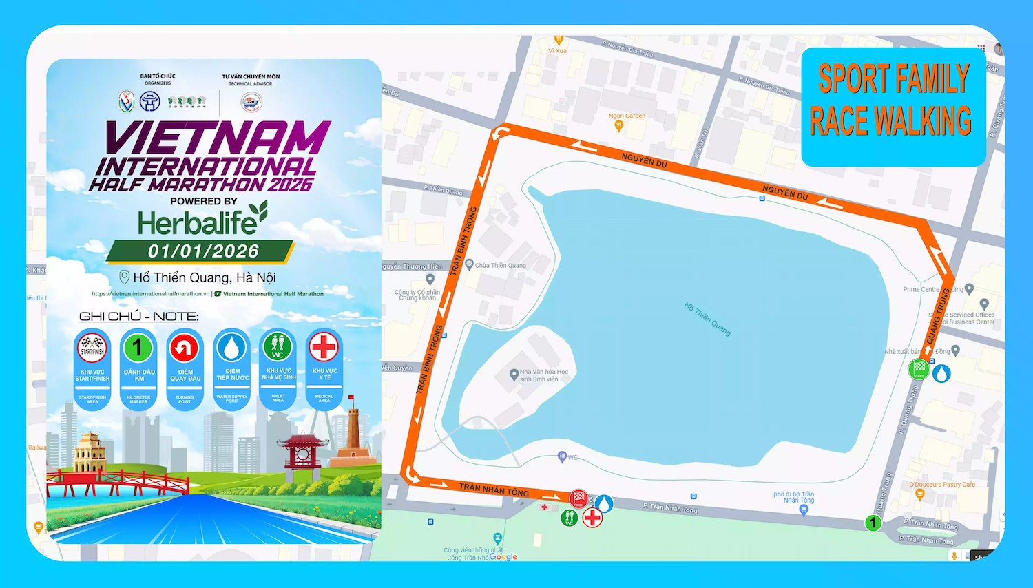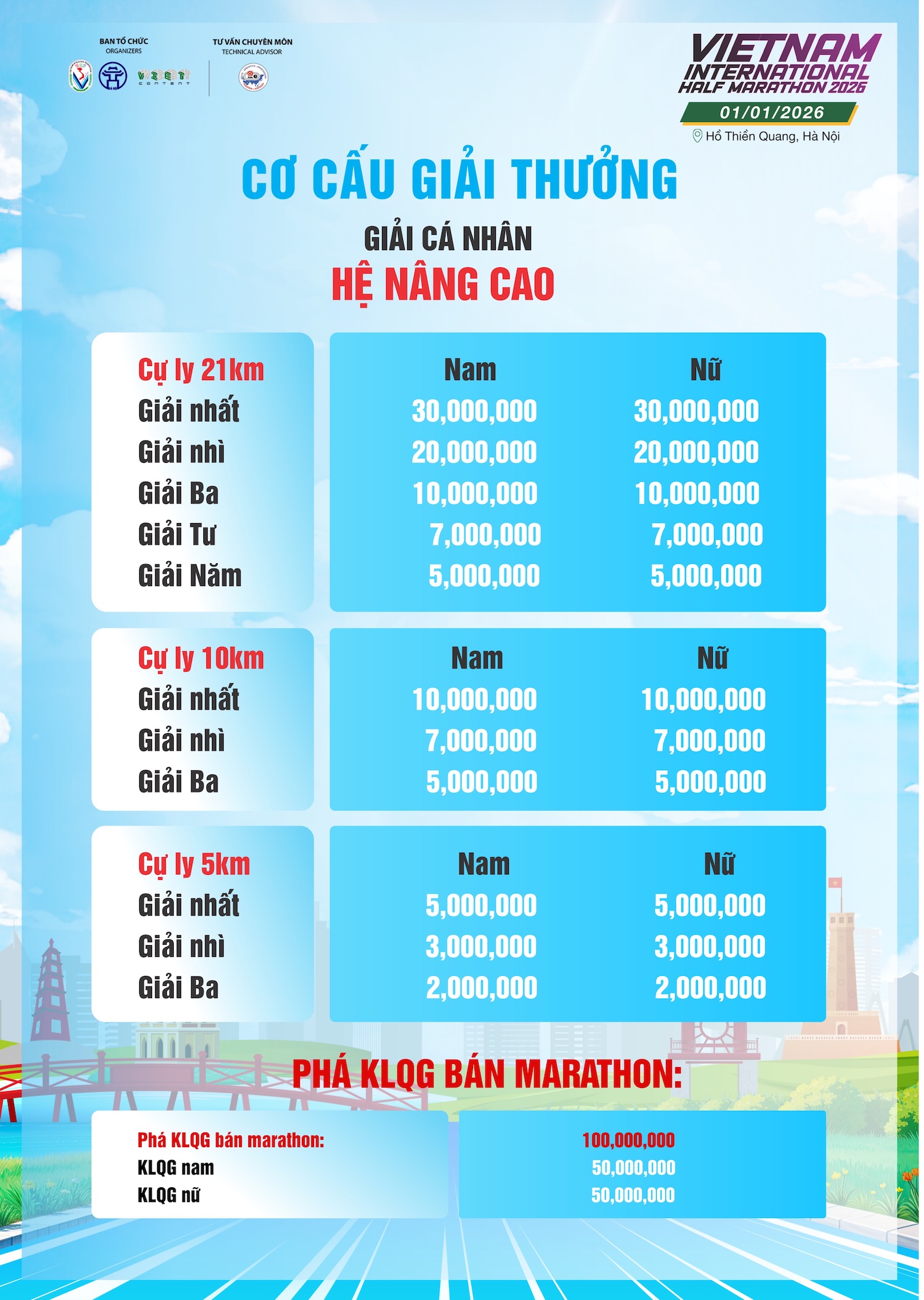 Bước sang năm thứ 4, Giải bán marathon Quốc tế Việt Nam 2026 đã trở thành điểm hẹn quen thuộc để chào đón năm mới bên bạn bè, người thân của các runner. Giải có điểm xuất phát và về đích tại Hồ Thiền Quang, Hà Nội với các cự ly 21km - 10km - 5km và gia đình thể thao. Trong mùa giải năm nay, BTC sẽ đón 7.000 VĐV tham dự.