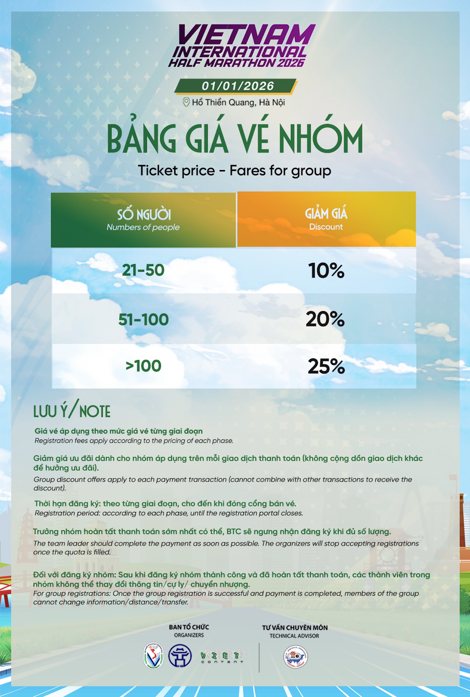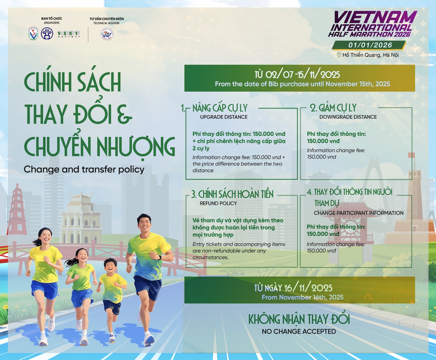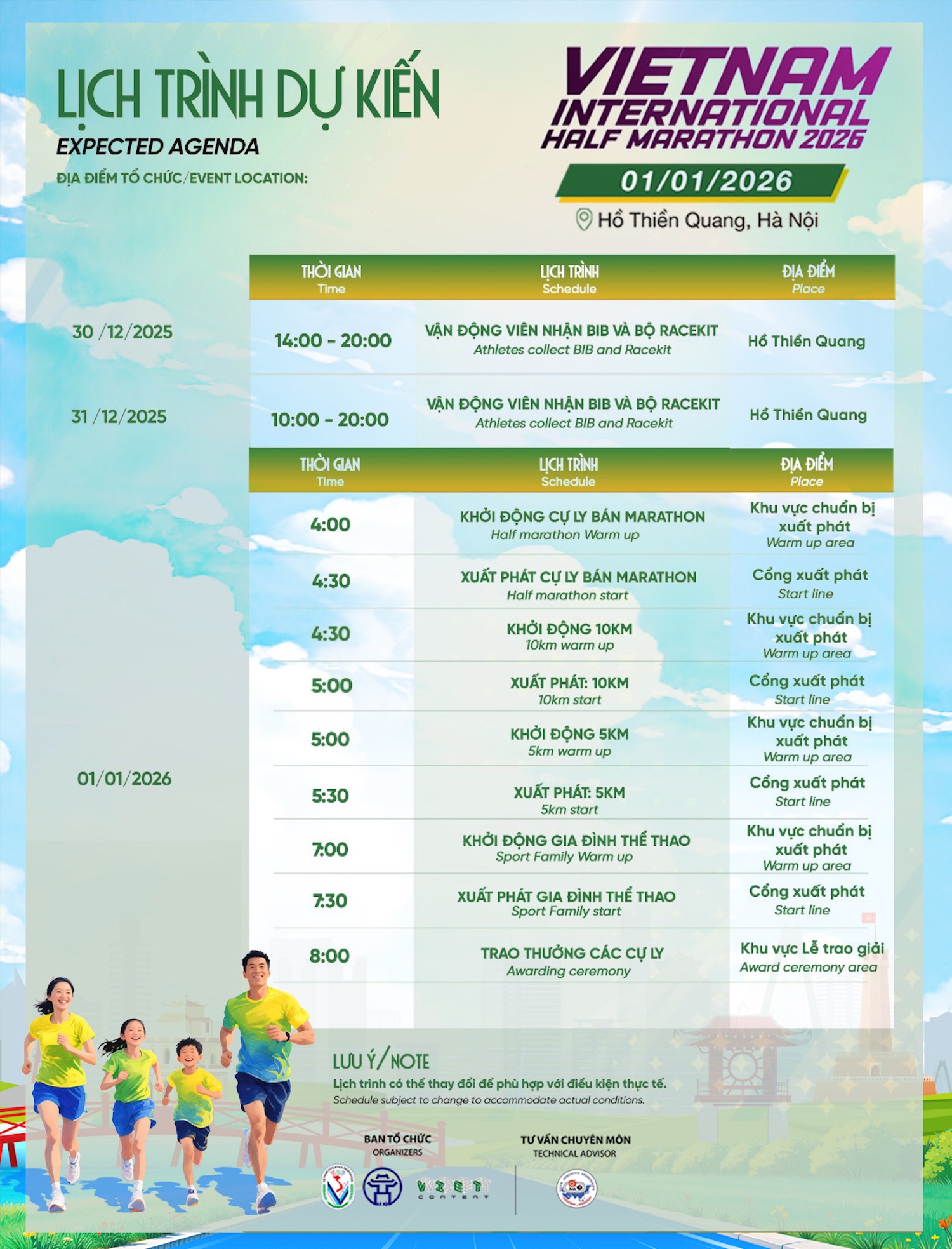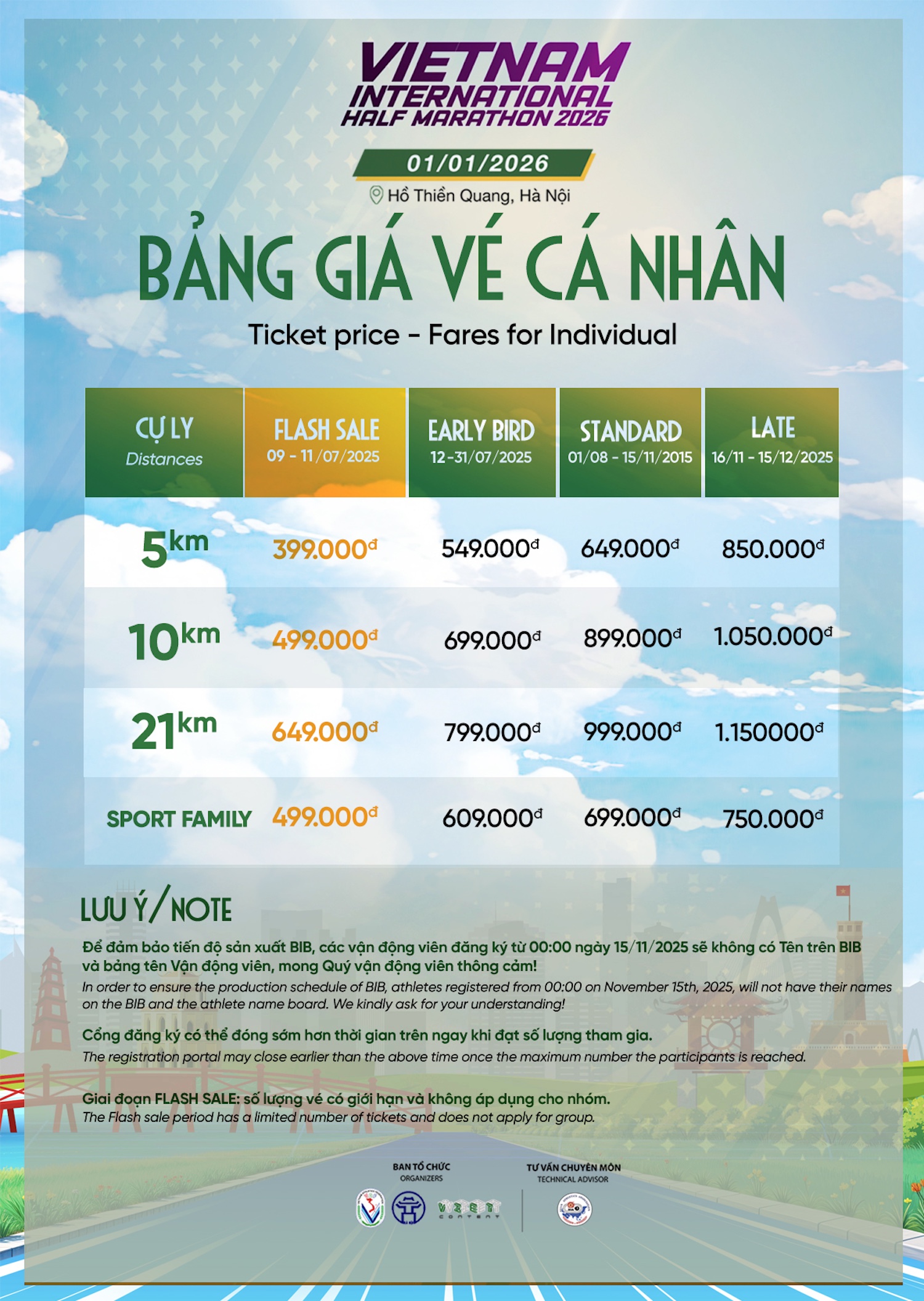 Bước sang năm thứ 4, Giải bán marathon Quốc tế Việt Nam 2026 đã trở thành điểm hẹn quen thuộc để chào đón năm mới bên bạn bè, người thân của các runner. Giải có điểm xuất phát và về đích tại Hồ Thiền Quang, Hà Nội với các cự ly 21km - 10km - 5km và gia đình thể thao. Trong mùa giải năm nay, BTC sẽ đón 7.000 VĐV tham dự.