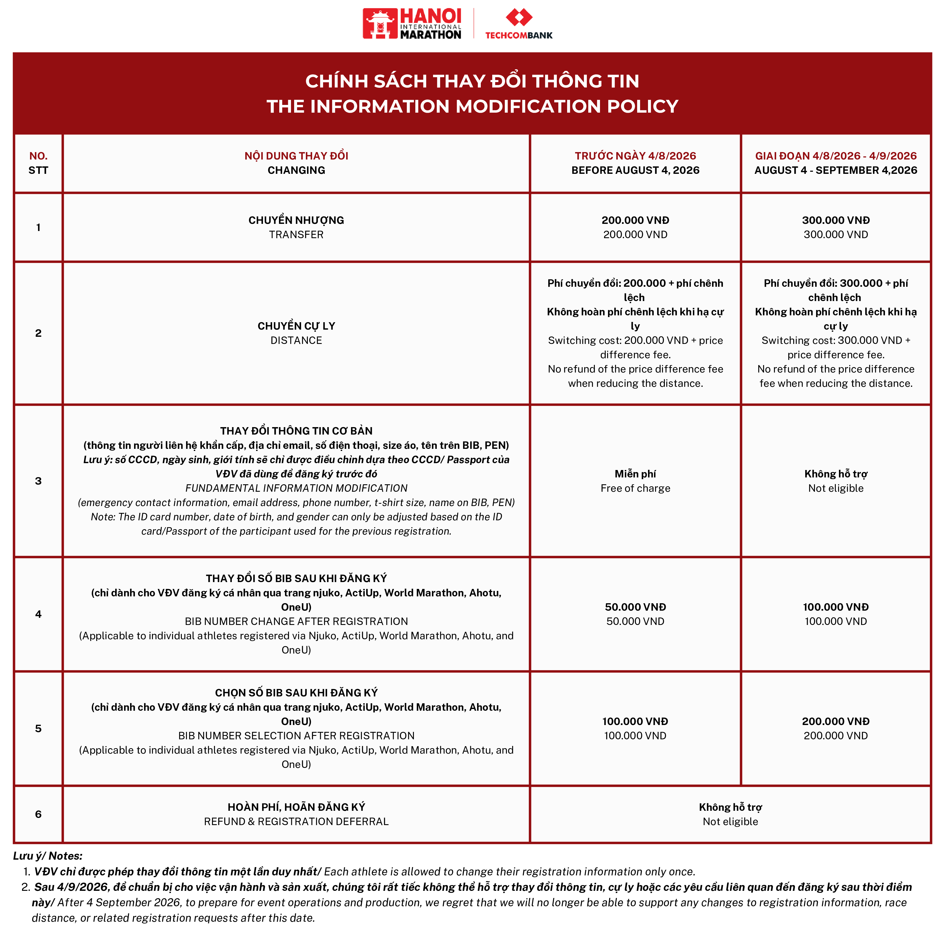 Vận động viên từ khắp nơi trên thế giới sẽ đến tham gia Tuần lễ sự kiện Giải Marathon Quốc tế Hà Nội Techcombank Mùa thứ 3. Có hai ngày thi đấu chính, bao gồm các cự ly: Marathon (42,195 km), Half Marathon (21,1 km), 10 km, 5 km và KIDS RUN (3 km và 1,5 km) dành cho trẻ em từ 5 đến 14 tuổi.
