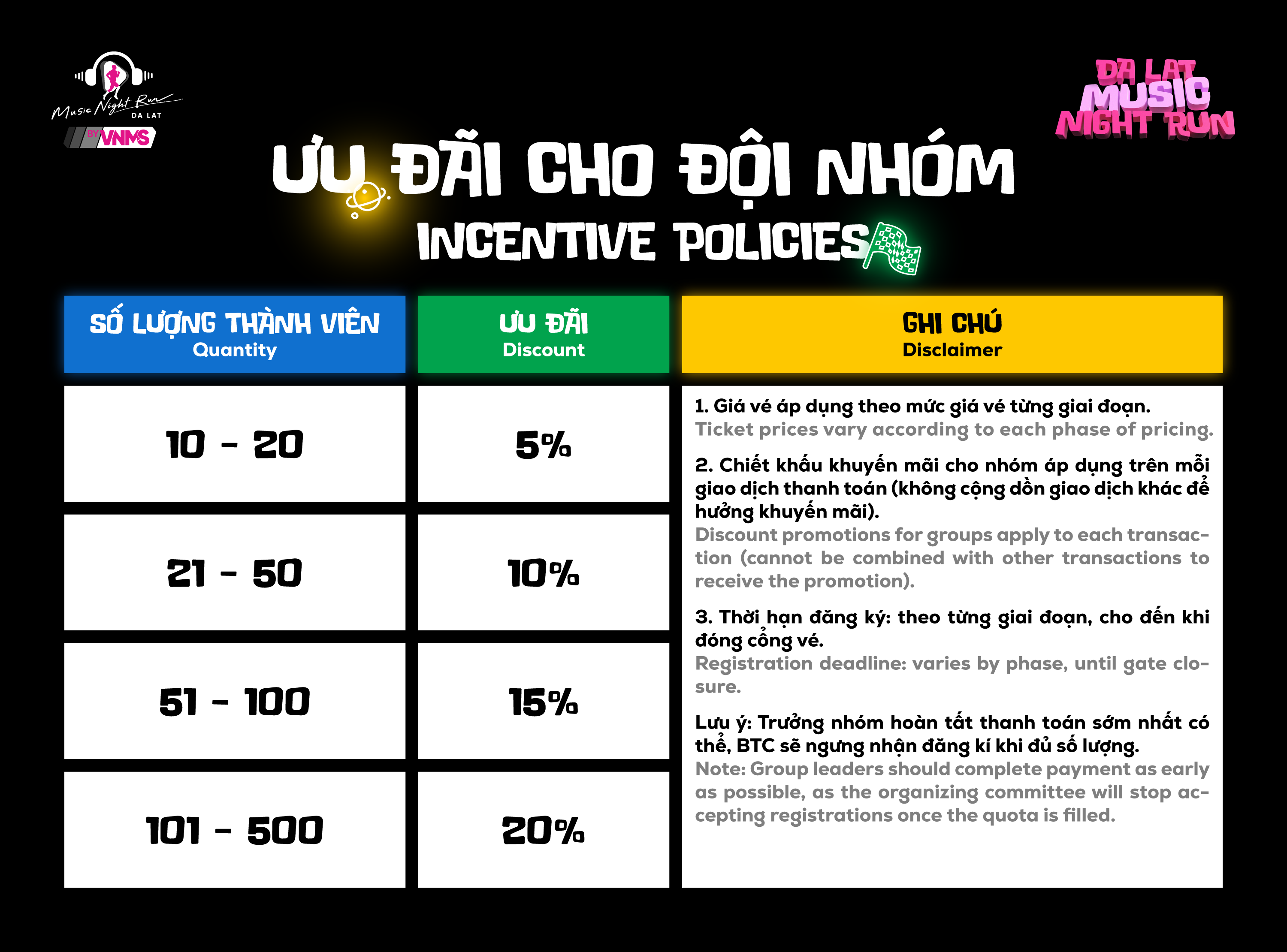 Da Lat Music Night Run 2026 đã chính thức trở lại, rực rỡ hơn, bùng nổ hơn. Một cung đường đạt chuẩn quốc tế, một sân khấu concert với dàn line-up đầy bất ngờ giữa trung tâm thành phố Đà Lạt, để mỗi runner được tỏa sáng theo màu sắc riêng của mình trong từng khoảnh khắc.